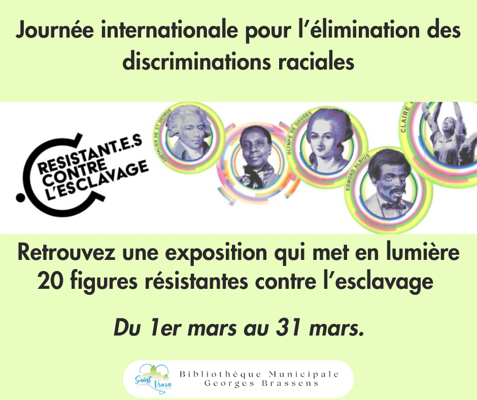 À l’occasion de la Journée internationale pour l’élimination des discriminations raciales, la Bibliothèque municipale Georges Brassens accueille une exposition consacrée aux résistant·e·s contre l’esclavage.