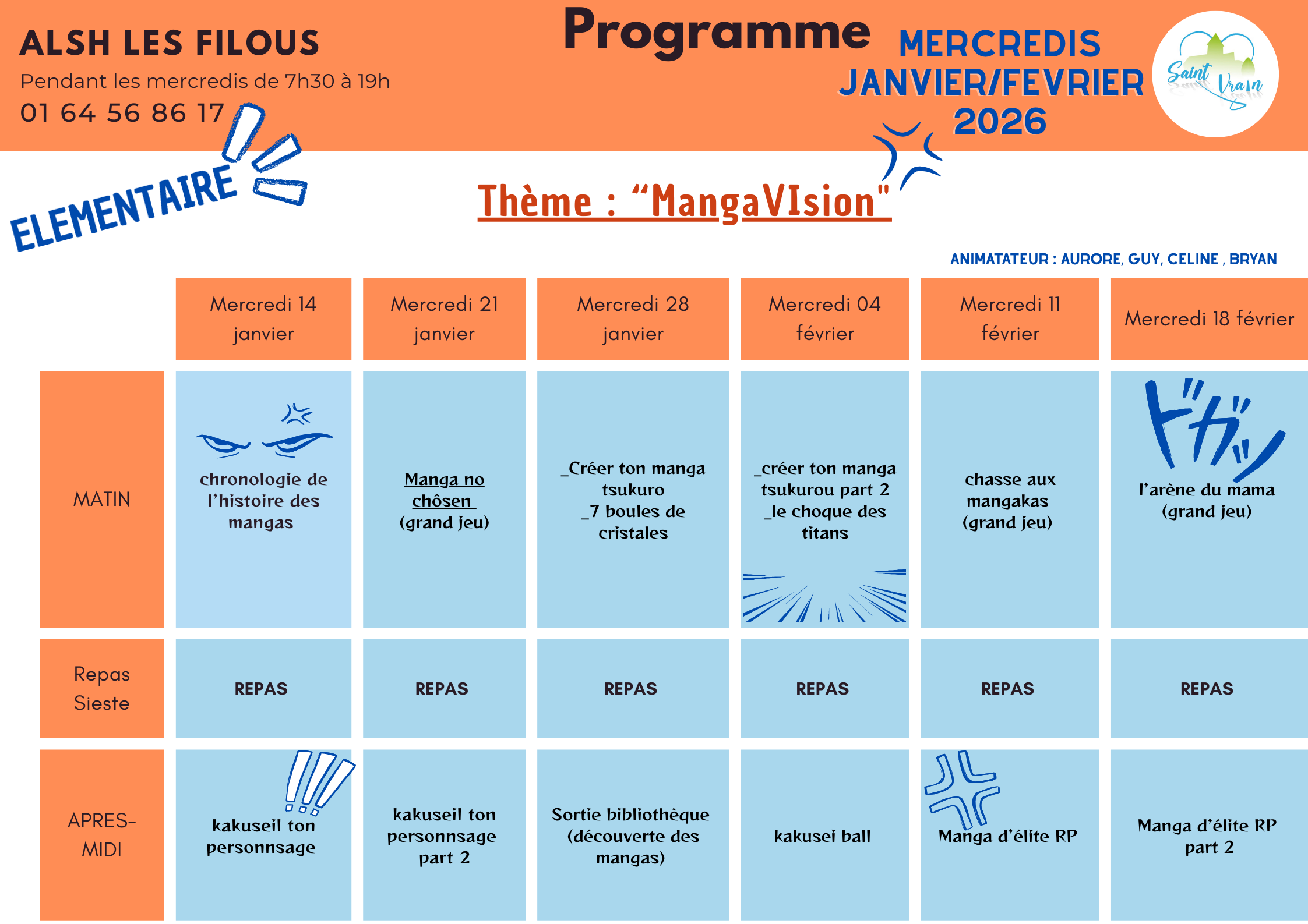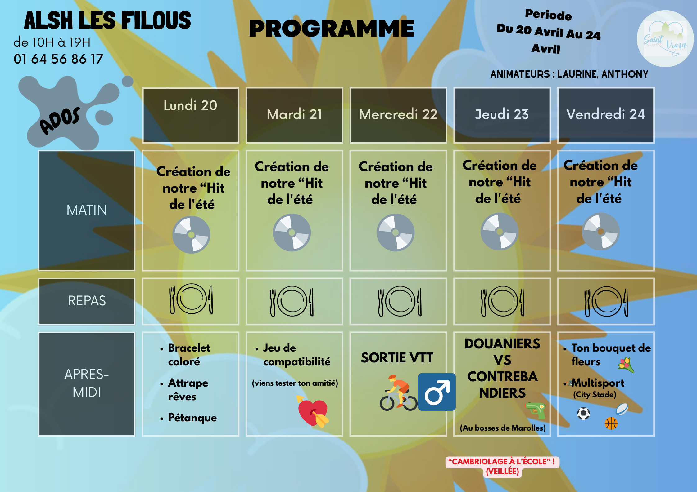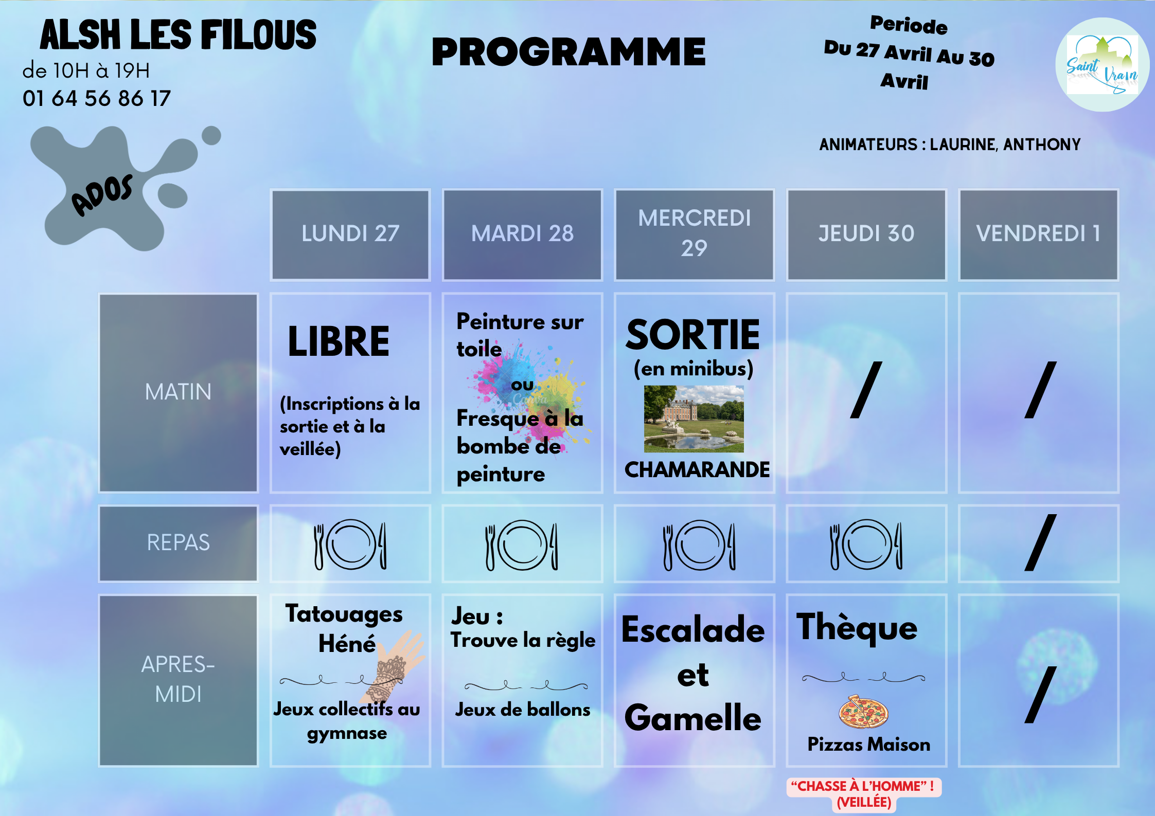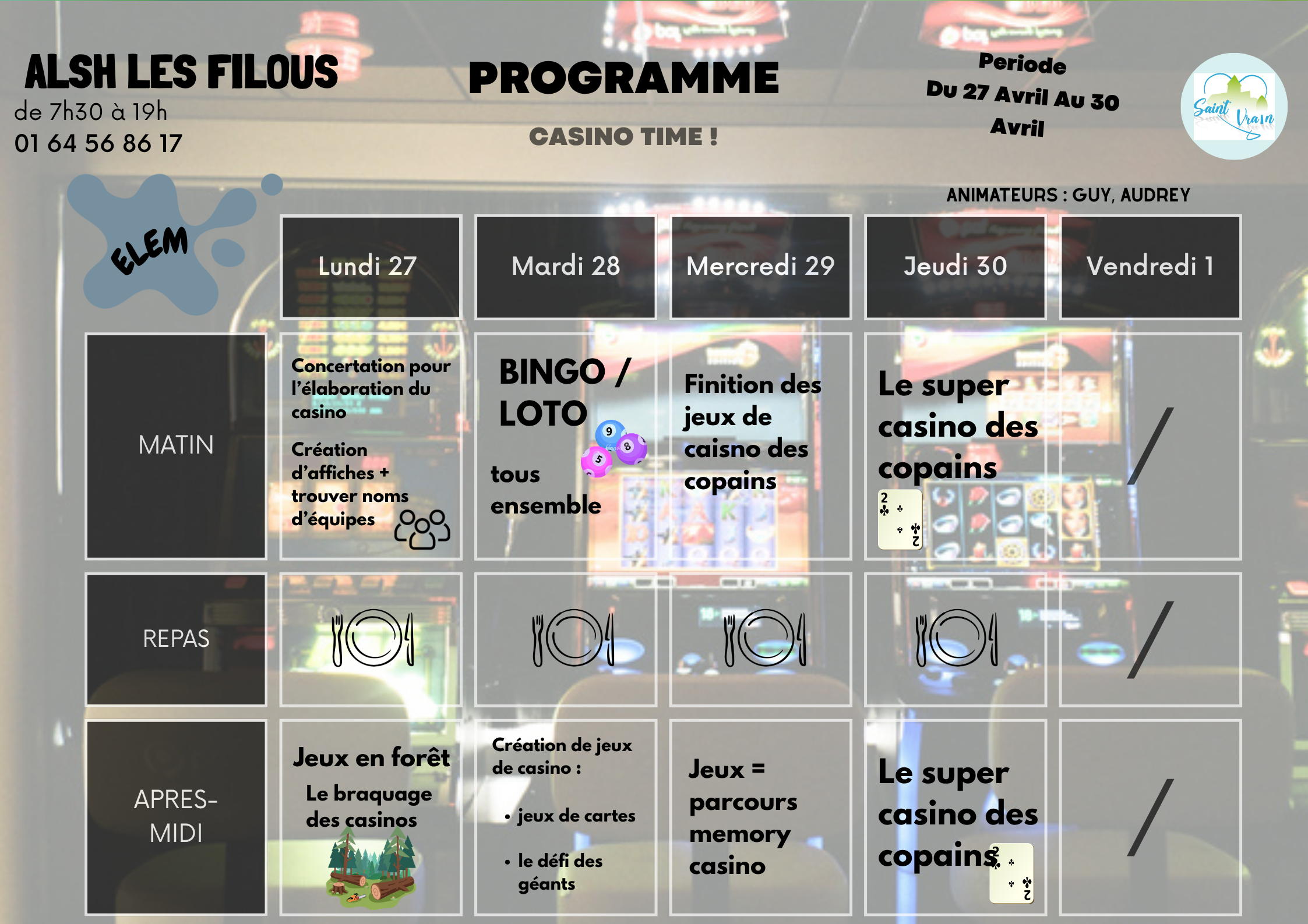 Les FILOUS, c’est le nom que porte l'Accueil de Loisirs Sans Hébergement de Saint-Vrain situé à la sortie du village, donnant sur une plaine verdoyante, aux abords d’une forêt magnifique et d’un stade municipal attrayant.
